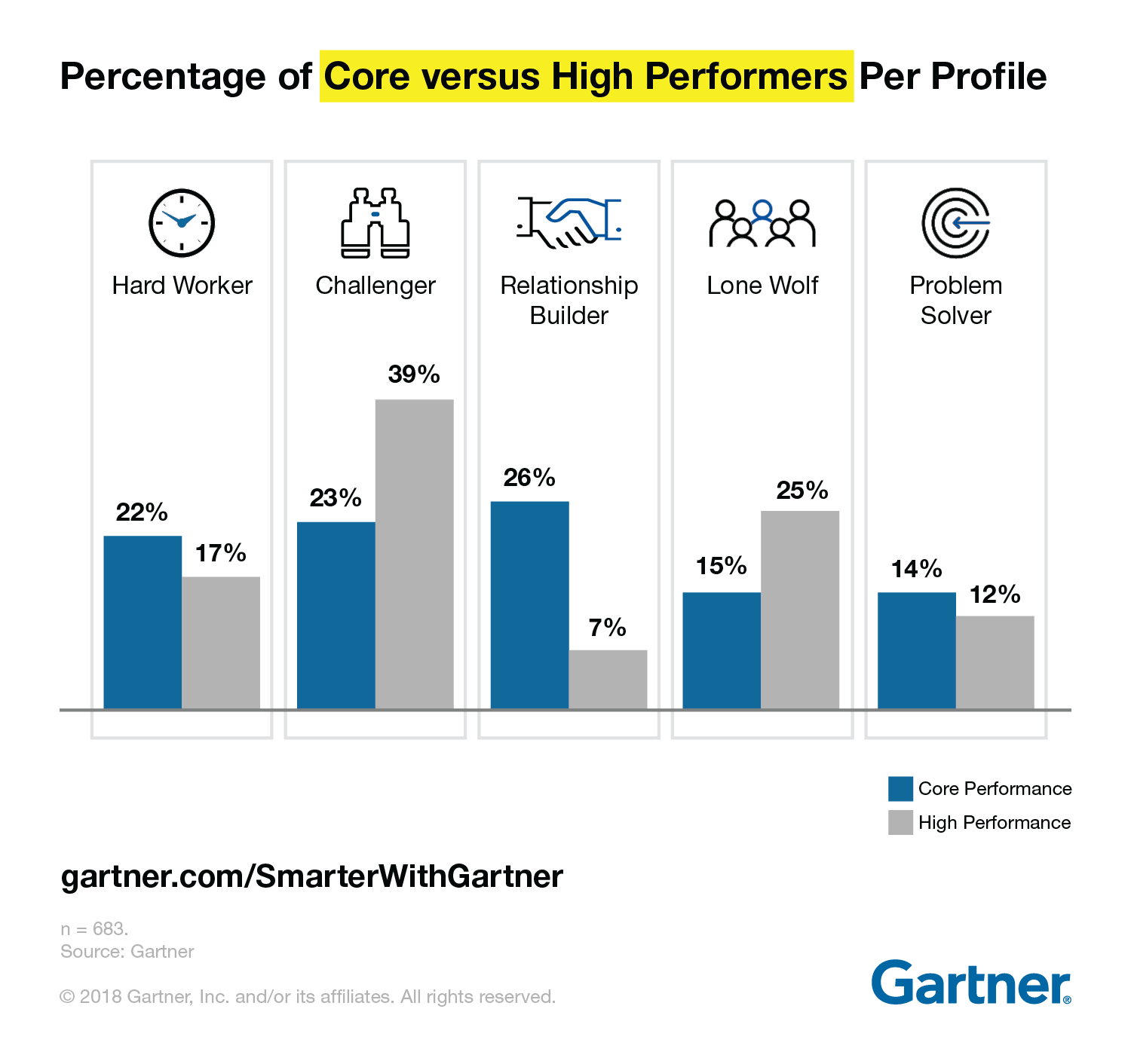 Mas, o que surpreendeu foi que, nos vendedores de alta performance, 39% tinham o perfil de desafiadores e, apenas 7% eram construtores de relacionamento.