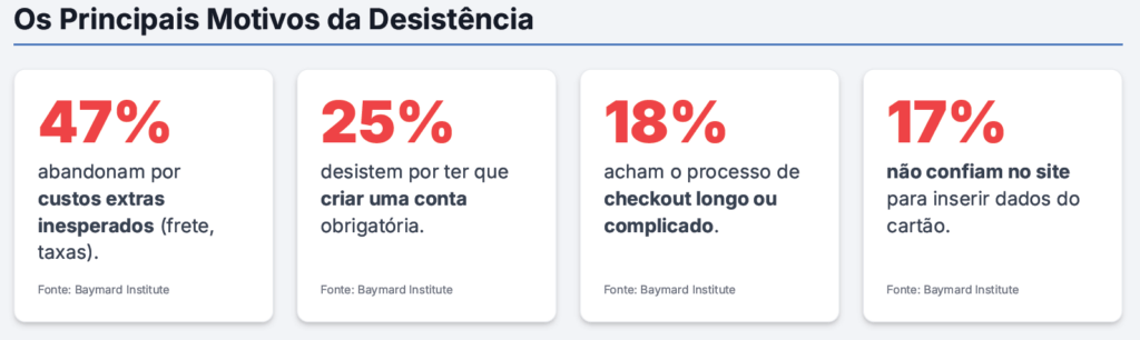 Grande parte dos abandonos nasce a partir de fricções contornáveis na jornada de compra, como custos extras inesperados, checkout longo, obrigatoriedade de criar conta, poucas formas de pagamento e baixa confiança no site.
