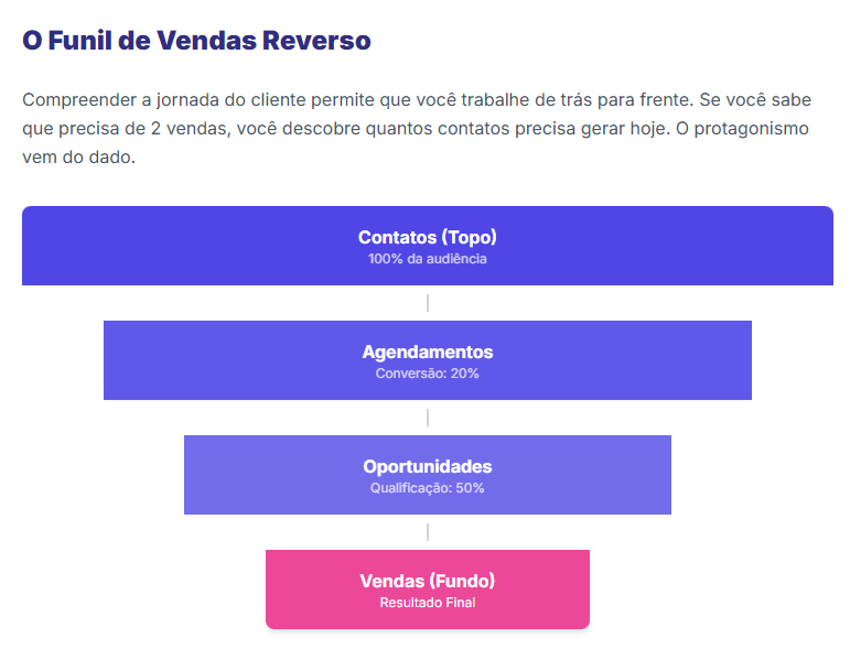 O segredo de um time de vendas de alta performance é a conta inversa. Se você conhece suas taxas de conversão em cada etapa do funil (Contatos → Agendamentos → Oportunidades → Vendas), a meta deixa de ser um desejo e passa a ser uma estatística.