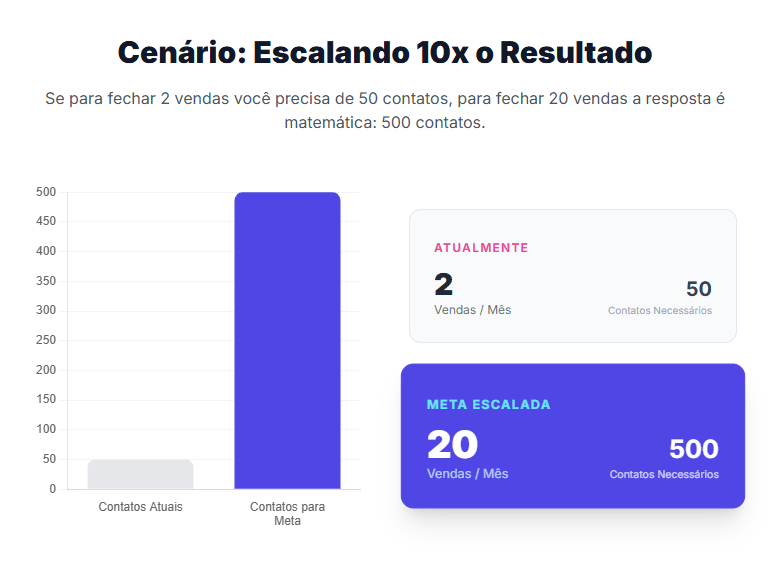 • Exemplo prático: Se a cada 50 contatos você agenda 10 reuniões e fecha 2 vendas, e sua meta é de 20 vendas, você já sabe que o hack não é “vender melhor”, mas sim garantir 500 contatos no topo do funil. O protagonismo vem de saber exatamente onde o esforço deve ser aplicado.
