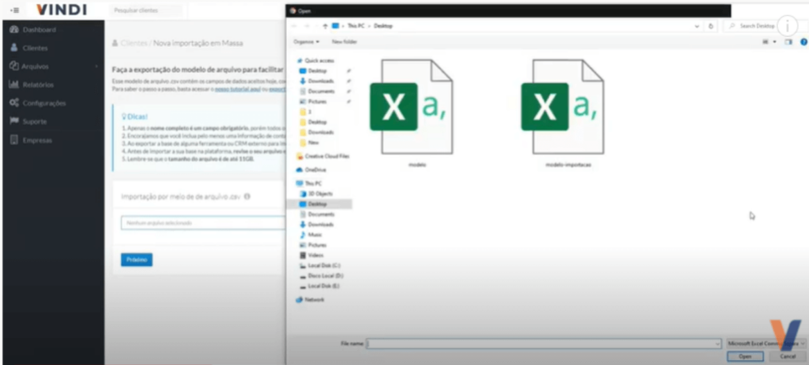Para importar os dados, basta usar uma planilha no formato .csv que a gente disponibilizou na própria plataforma da Vindi. Basta baixar o arquivo no formato padrão, elaborar a planilha nos campos e dados e importar os clientes em massa de forma simples.