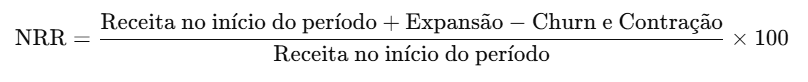Entender a Net Revenue Retention (NRR) na prática significa saber exatamente como ela é calculada. A fórmula é simples, mas extremamente poderosa: ela mostra o quanto sua base de clientes está contribuindo (ou deixando de contribuir) para o crescimento da receita — considerando ganhos e perdas dentro do mesmo grupo de clientes.