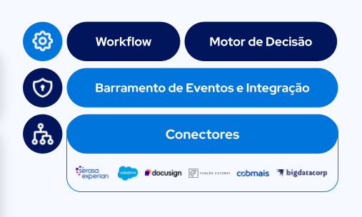 • Orquestrador: composto por workflow, motor de decisão e barramento de integração, permitindo um gerenciamento eficiente e integrado dos processos.