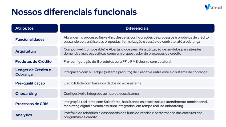 Com a sua arquitetura componível e aberta, a Vindi oferece a possibilidade de utilização de módulos para atender às demandas específicas dos clientes, garantindo um negócio de crédito pronto, com processos inteligentes, equipe especializada e tecnologia de classe mundial.