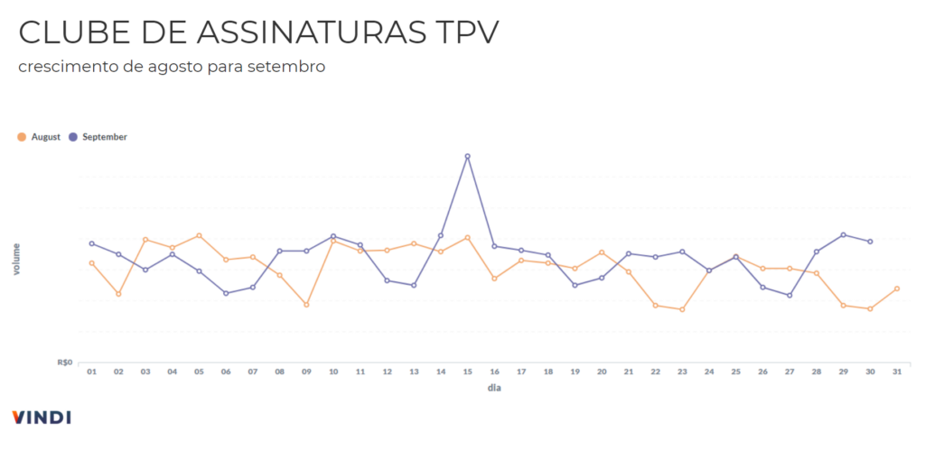 Considerando o TPV total da Vindi, um dado extra para o Vindi Insights é que a quantidade de transações na plataforma subiu 2,1% em setembro.